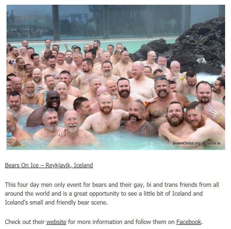 BEARS ON ICE er handan við hornið en viðburðurinn hefst þann 30. ágúst með Welcome Partýi í Petersen svítunni. BEARS ON ICE stendur yfir í 4 daga en aðalkvöld hátíðarinnar fer fram laugardagskvöldið 1. september í Ægisgarði þar sem fram koma skemmtikraftarnir Doctor Woof frá London, Jackie Moon, Pixy Strike og Haffi Haff. DJ Dramatik sér svo um tónlistina. Von er á um 130 erlendum gestum á hátíðina í ár en uppselt er í allar skoðunarferðir en skipuleggjendur vonast til að sjá sem flesta íslenska stráka mæta í partýin á meðan á hátíðinni stendur.