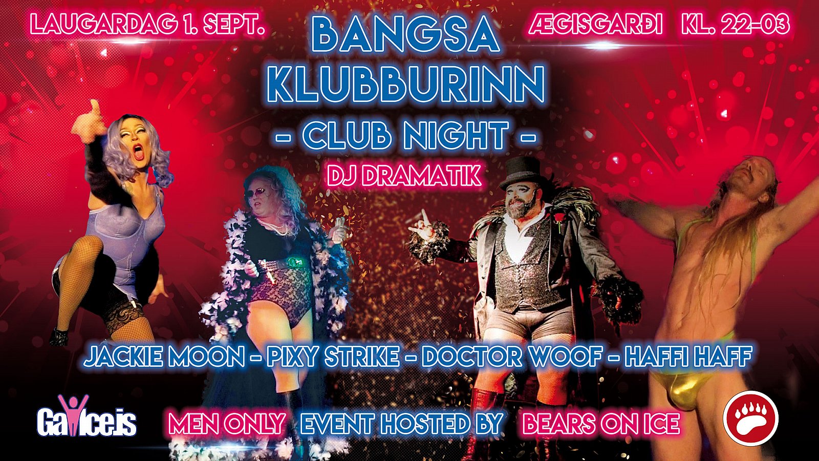 BEARS ON ICE er handan við hornið en viðburðurinn hefst þann 30. ágúst með Welcome Partýi í Petersen svítunni. BEARS ON ICE stendur yfir í 4 daga en aðalkvöld hátíðarinnar fer fram laugardagskvöldið 1. september í Ægisgarði þar sem fram koma skemmtikraftarnir Doctor Woof frá London, Jackie Moon, Pixy Strike og Haffi Haff. DJ Dramatik sér svo um tónlistina. Von er á um 130 erlendum gestum á hátíðina í ár en uppselt er í allar skoðunarferðir en skipuleggjendur vonast til að sjá sem flesta íslenska stráka mæta í partýin á meðan á hátíðinni stendur.